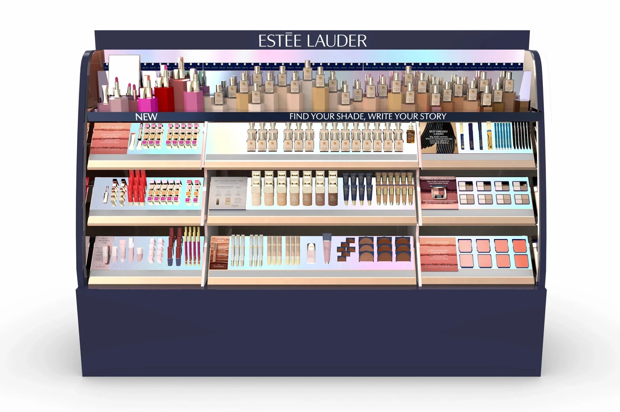 lineales oscuros, producto iluminado, displays limpios, tester visibles y accesibles.